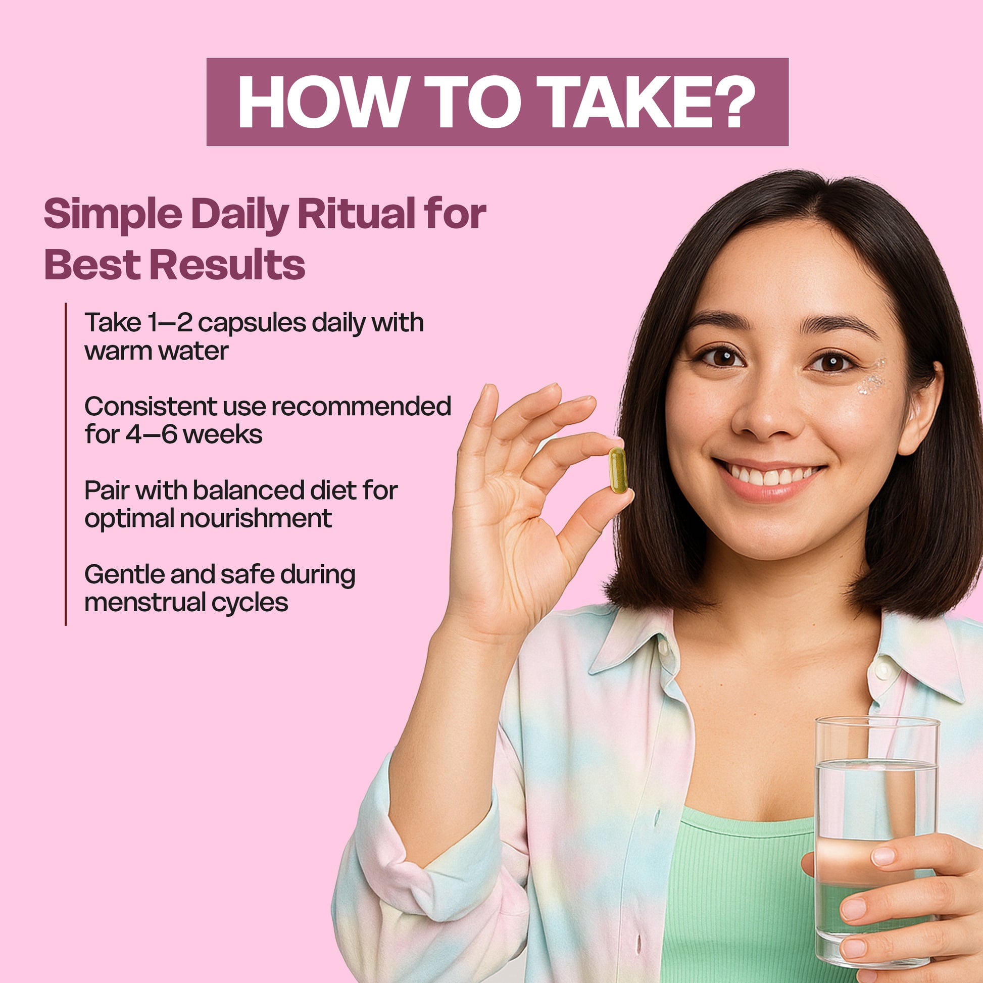 रोज़ाना 1–2 कैप्सूल गुनगुने पानी के साथ लें या चिकित्सक के निर्देशानुसार।